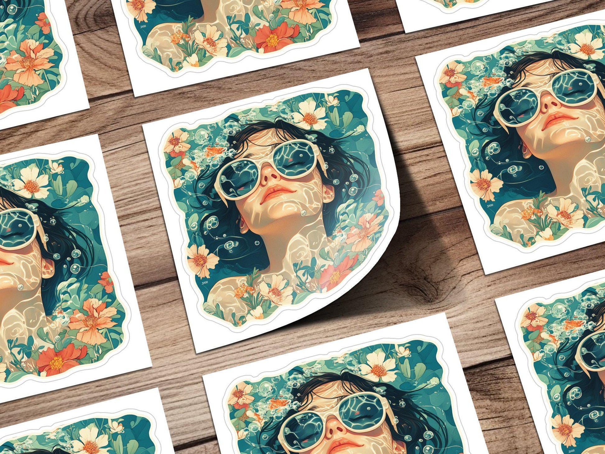 This dreamy summer girl in water sticker is perfect for those who love vibrant illustrations and unique designs. Featuring a girl with sunglasses surrounded by beautiful flowers and enchanting water reflections, this sticker brings mermaid vibes and floral adventure to any surface. Ideal for decorating laptops, water bottles, notebooks, and more, it's a wonderful addition for art enthusiasts and sticker collectors.